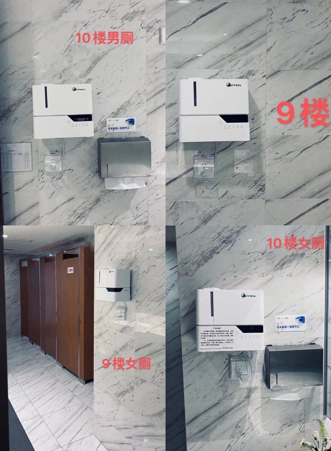 杭州黃龍萬科中心由于其寫字樓特性導致其洗手間整體式密封的,沒有窗戶和空氣流通的地方,洗手間使用人數也較多,造成其有異味特別是臭味,同時也有大量細菌問題,目前市面上的產品有掩蓋臭味的功效,或者物理吸附臭味,但沒有真正分解臭味和殺菌的產品,所以客戶選擇了我們幫助解決其洗手間臭味和細菌問題。